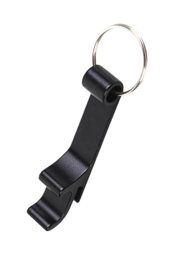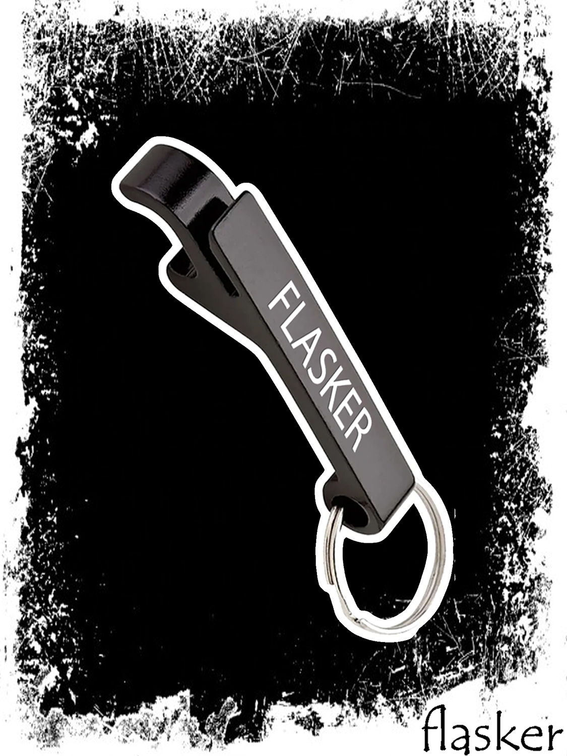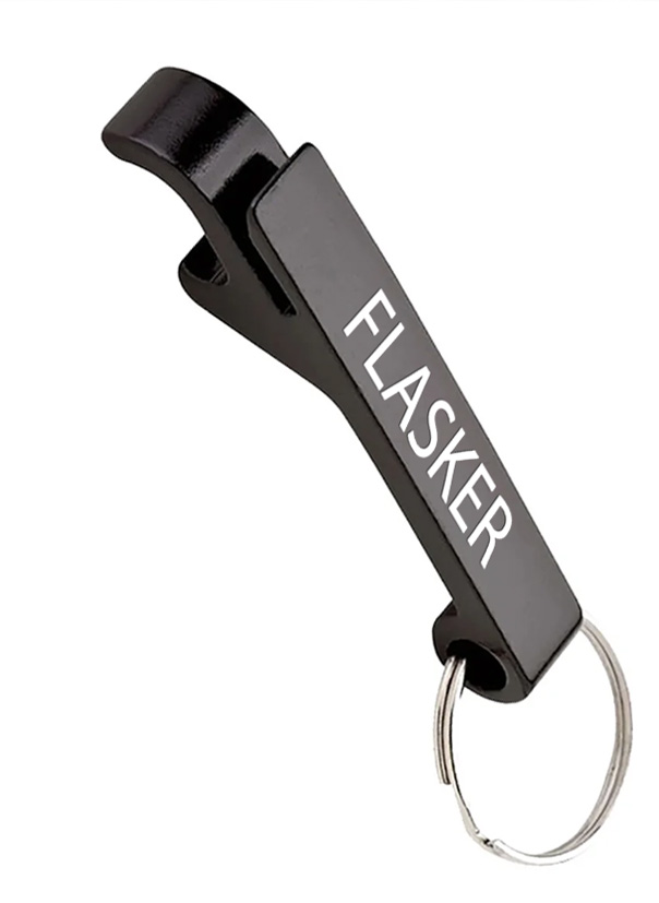 Компактний металевий брелок з логотипом Flasker. Створений спеціально для пивних пляшок із металевими корками (crown caps). Має додатковий виступ, який допомагає легко підчепити язичок на алюмінієвій банці — без ризику зламати ніготь.